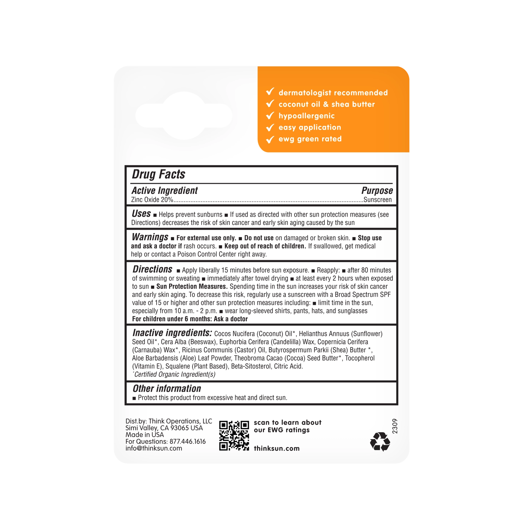 Thinkbaby sunscreen stick provides 100% mineral, non-nano Zinc Oxide protection anytime, anywhere- without the harmful chemicals. Travel friendly size! With a high SPF 30 rating, our dermatologist-recommended, water-resistant formula is EWG rated with safe ingredients for fun in the sun at home or on-the-go. Reasons to ♥ : *Gentle for sensitive, delicate skin *Stick application is perfect for touch ups on-the-go *Water-Resistant for up to 80-minutes *Fragrance-Free for sensitive little ones Formulated with skin-nourishing ingredients! *100% Mineral, non-nano Zinc Oxide with broad spectrum UV protection in a lightweight, non-sticky formula *Nourishing Cocoa Seed Butter and Shea Butter moisturize baby’s skin *Vitamin E protects against environmental aggressors