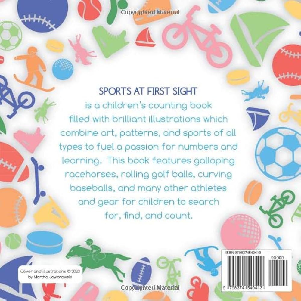 Sports at First Sight is a children’s counting book filled with brilliant illustrations which combine art, patterns, and sports of all types to fuel a passion for numbers and learning. This book features galloping racehorses, rolling golf balls, curving baseballs, and many other athletes and gear for children to search for, find, and count.