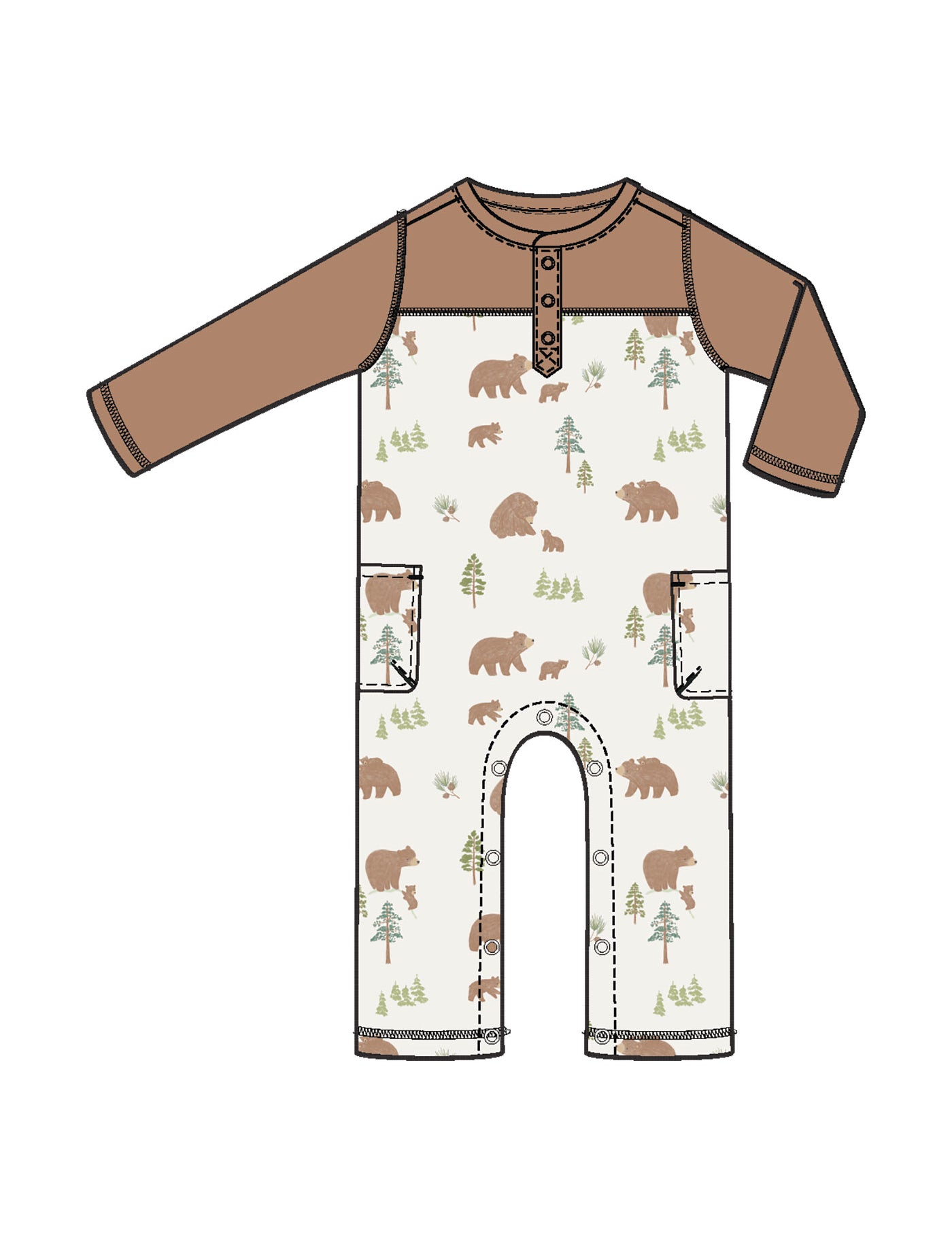Sweet Brown Bears - Romper w/ Contrast Sleeves