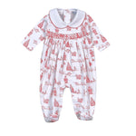 Dress your little one in holiday charm with the Baby Loren Red Christmas Toile Smocked Footie. Made from 100% cotton, this soft and cozy footie features a delicate smocked design and a classic red Christmas toile print. Perfect for winter cuddles, Christmas morning, and all the magical moments in between.