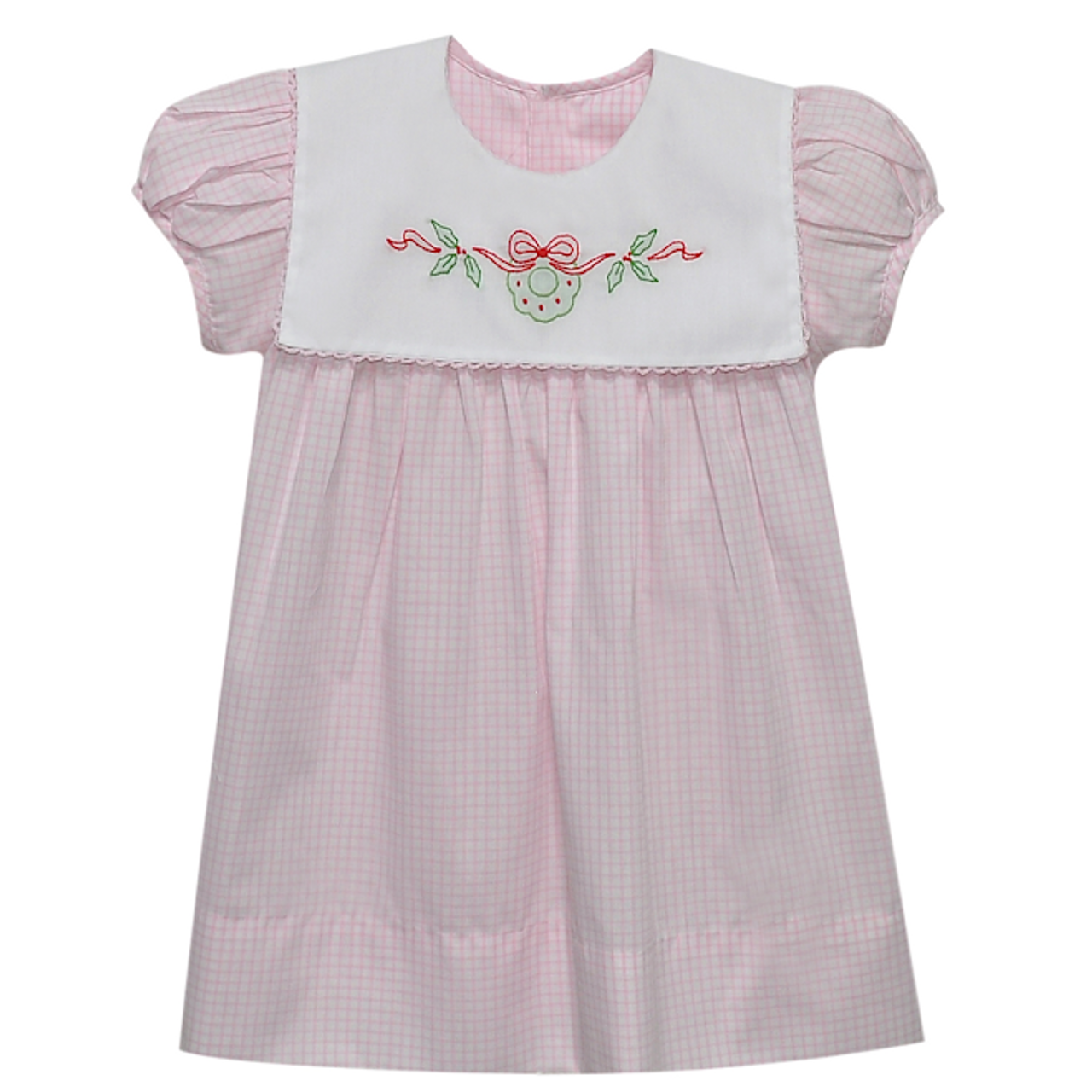 Pink smocked dress, girls holiday dress, Christmas wreath dress, pink gingham baby dress, toddler smocked dress, boutique girls dress, classic children's clothing, heirloom baby dress, wreath embroidered dress, Reese dress, baby girl Christmas outfit puff sleeve dress for girls, vintage style kids clothing, hand smocked dress, southern baby dress, traditional girls clothing, pink dress toddler, dress for family photos