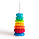 Drop the vibrant discs onto the threaded corkscrew pole and go ooooh as they spin fast and smooth to settle onto the reversible base. Choosing how to set the base is half the fun for your toddler. Pick either the wobble base or turn it over for a solid seat. Each disc is dual-colored, and from largest to smallest, they form a dynamic rainbow utilizing fun shades like magenta, lime, and teal, and your more traditional shades of lemon, red, and sky blue. The star-like discs alternate between daisy style and star-burst shapes, too. Want to make a rainbow? Want to keep all the round-edged shapes separate? You can! Even the smallest disc can spin all the way to the base. Awww, all the discs are in order; what now? Taking the SpinAgain apart so you can start spinning again might just be the best part! Lift up on the easy-to-release central pole and all the discs spin off the bottom!