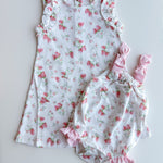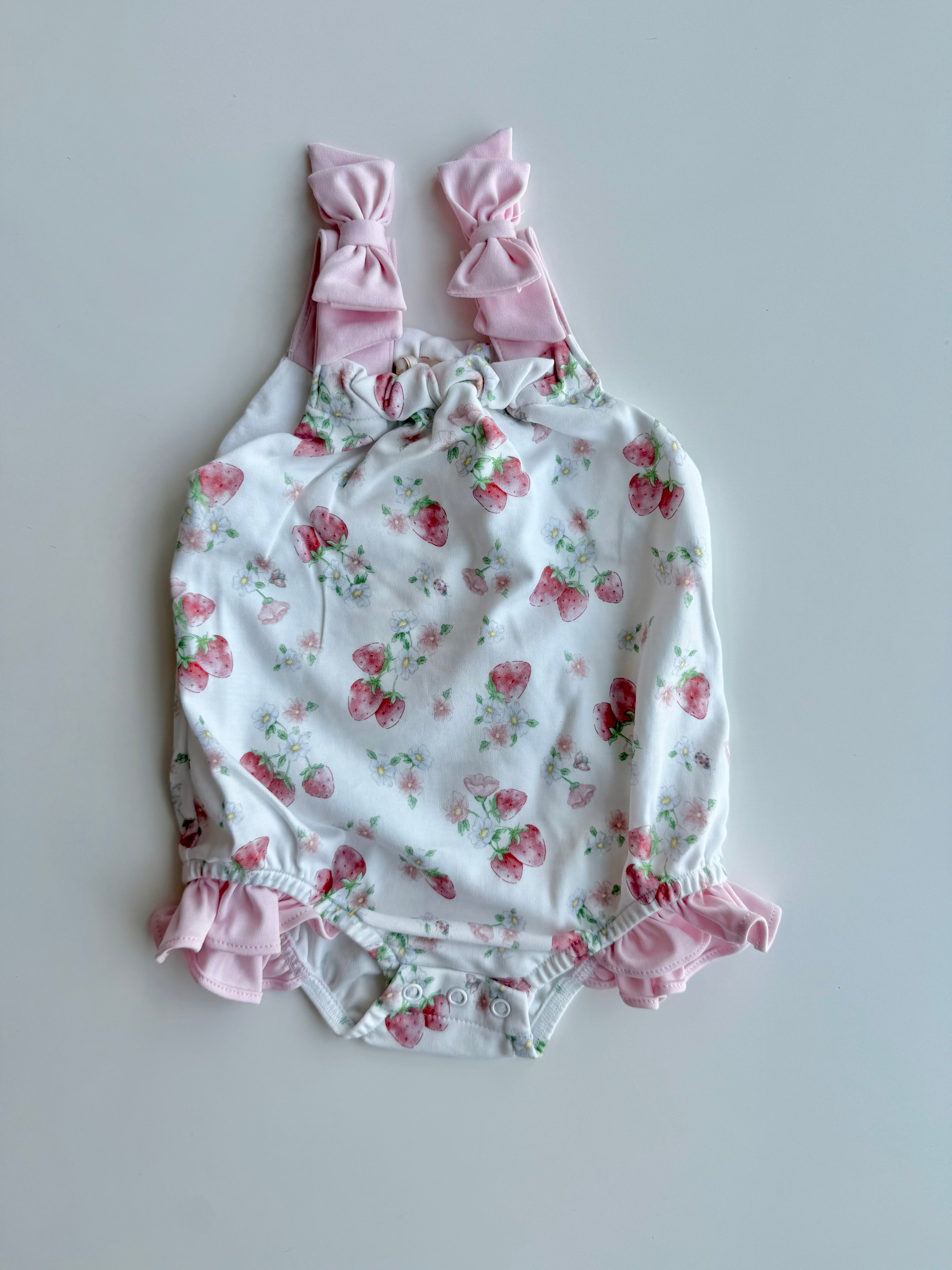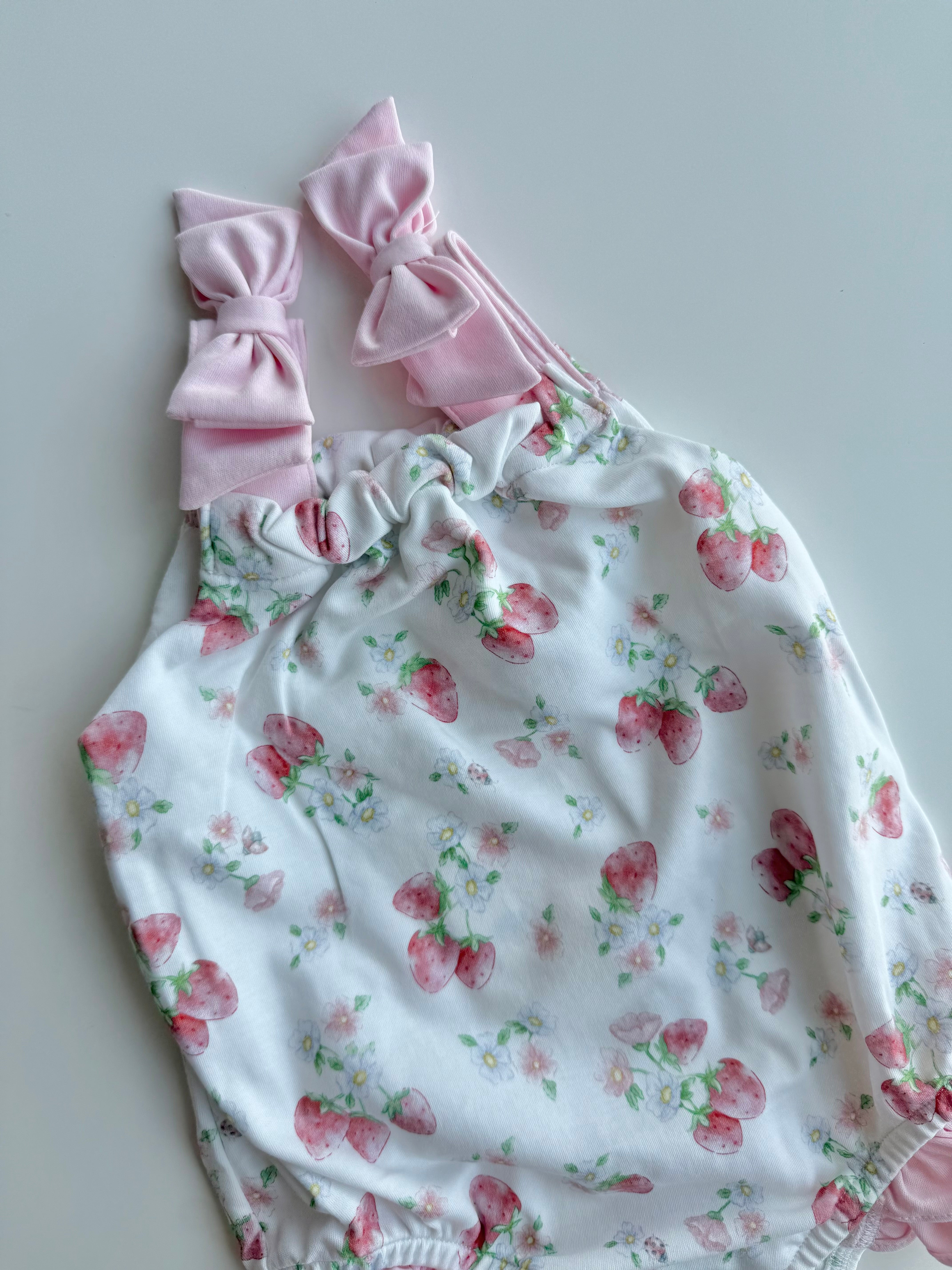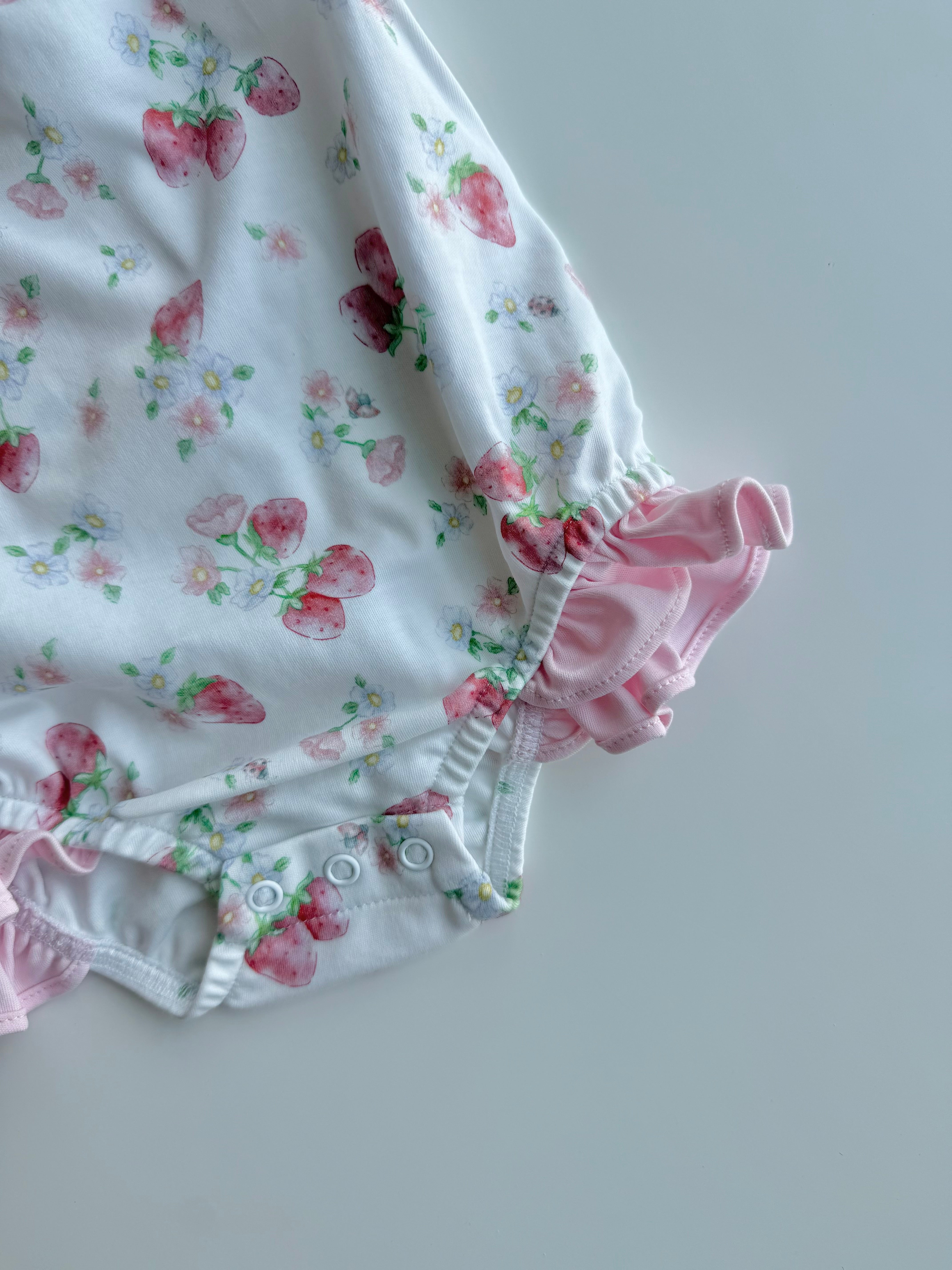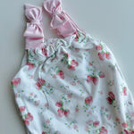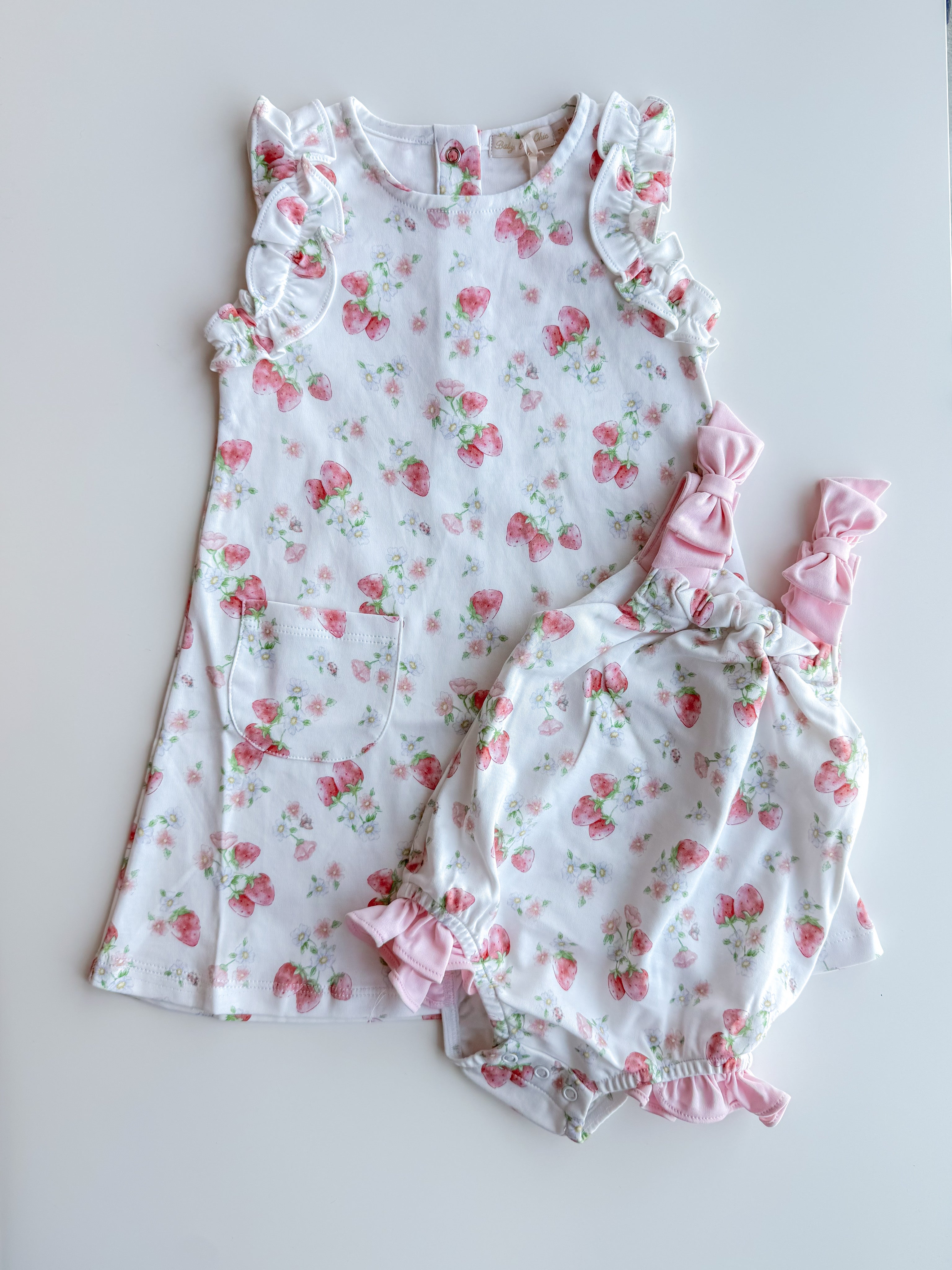 Delightfully sweet and timeless, our Strawberry Kisses Bubble is designed with the prettiest floral strawberry print for a whimsical touch of charm. Featuring statement bow accents at each shoulder and delicate detailing throughout, this darling piece is as beautiful as it is practical with convenient crotch snaps for easy changing. Complete the look with the coordinating sister dress for the sweetest matching moment.