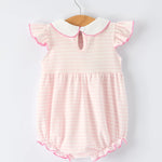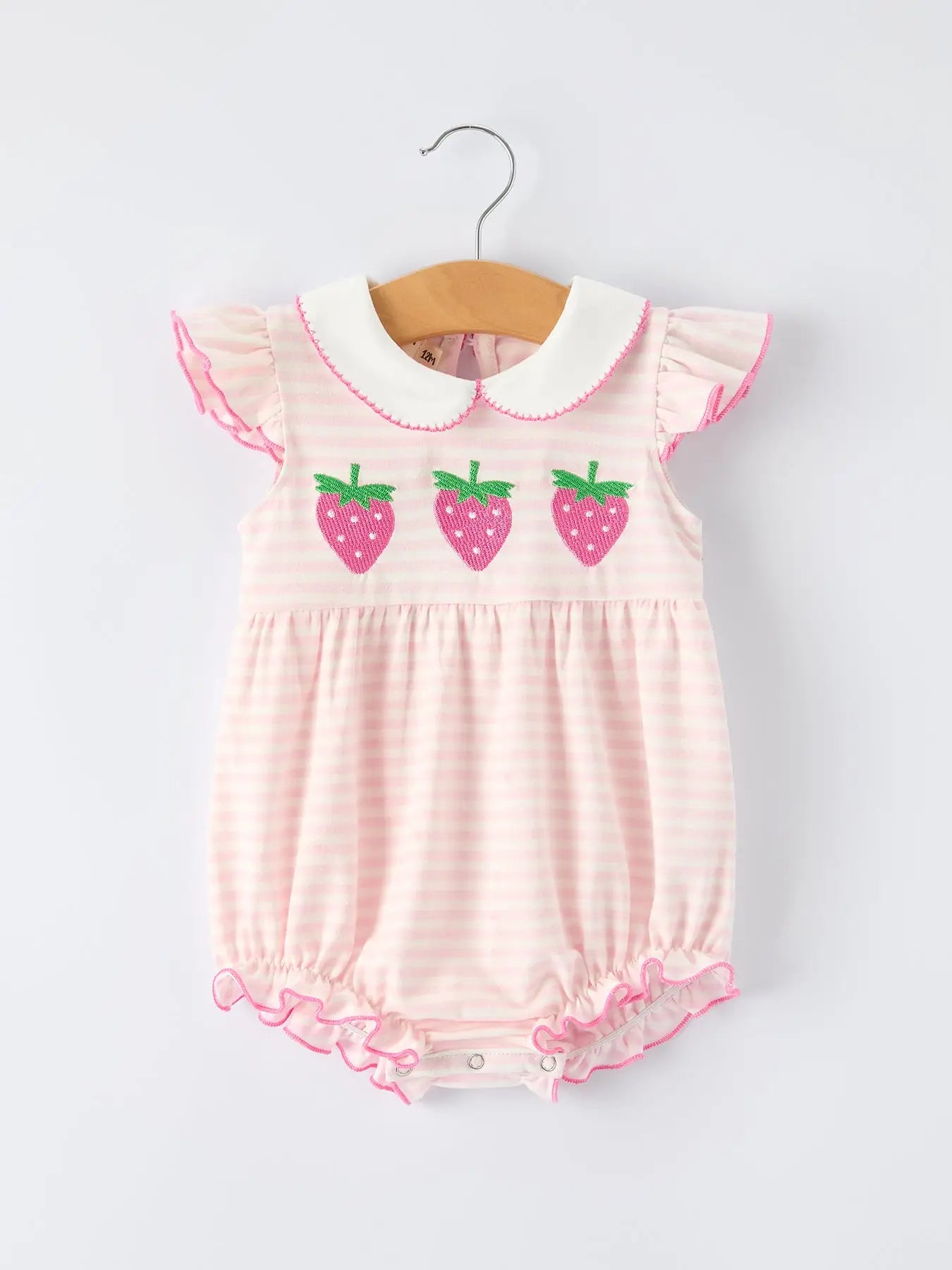 Sweeten her wardrobe with the Strawberry bubble, a charming piece that combines classic style with playful details. The delicate ruffle Peter Pan collar adds timeless elegance, while the cheerful strawberry print brings a fun, whimsical touch that little girls love.
