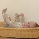 Full double-zip footie crafted from our soft and stretchy bamboo fabric. Fold-over hand mitts included on sizes NB – 3-6M. Raised screen print on soles of size 6-12M for added traction.