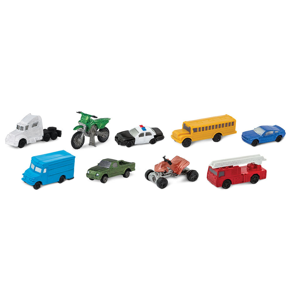 Turn any sandbox or sensory bin into a mini worksite with this set of 6 bright and colorful miniature construction vehicles! Kids can learn all about these heavy duty machines without ever having to put on a hard hat.