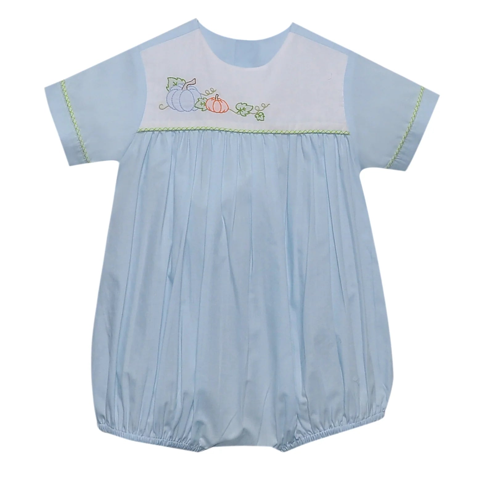 The sweetest little fall look for your baby girl. This blue Pumpkin Embroidered Bubble features soft 100% cotton fabric and beautifully detailed pumpkin embroidery, designed to match perfectly with our Pink Bryn Dress for big sister. The classic bubble silhouette allows for easy movement and all-day comfort, whether she’s at the pumpkin patch, celebrating Thanksgiving, or joining in family photos.