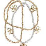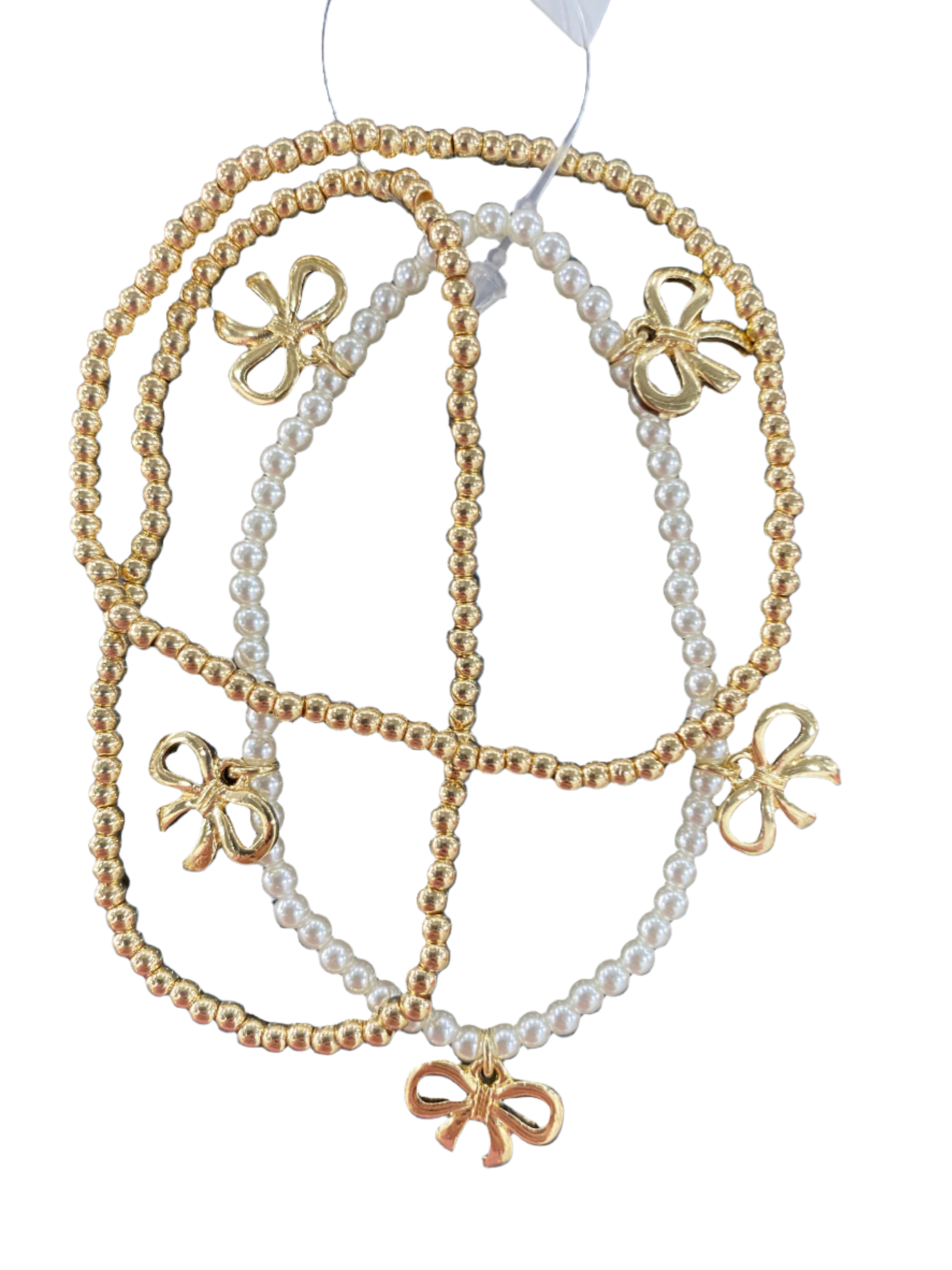 -3 Bracelets Per Stack, Two gold bracelets with bows. and one pearl bracelet with bows.