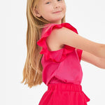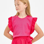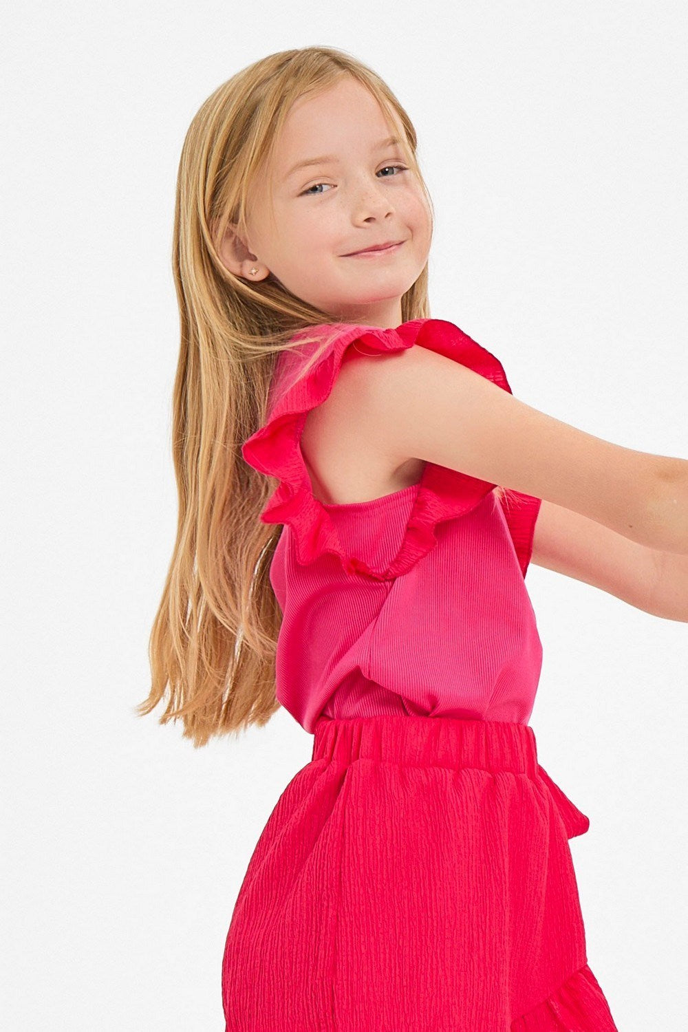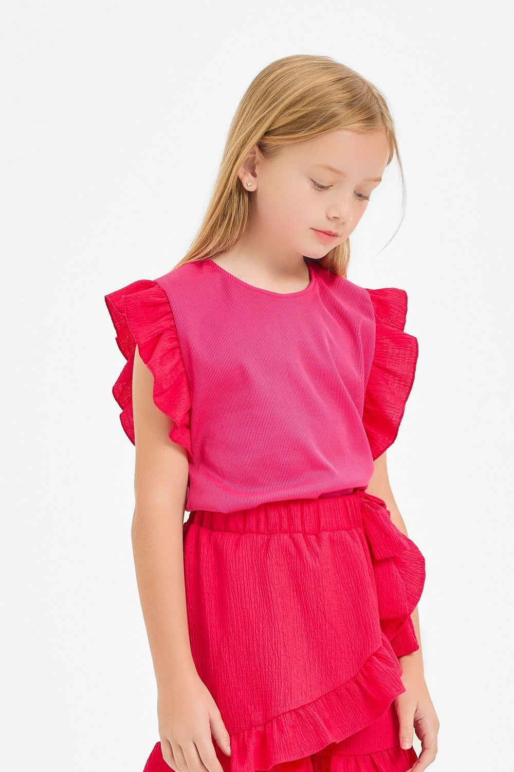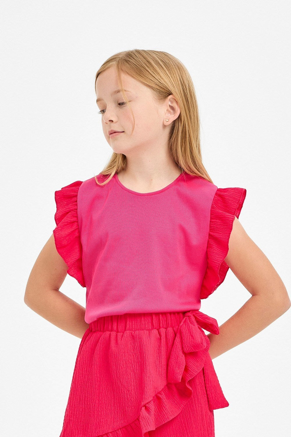 Ruffle Sleeves Ribbed Knit Top - Hot Pink
