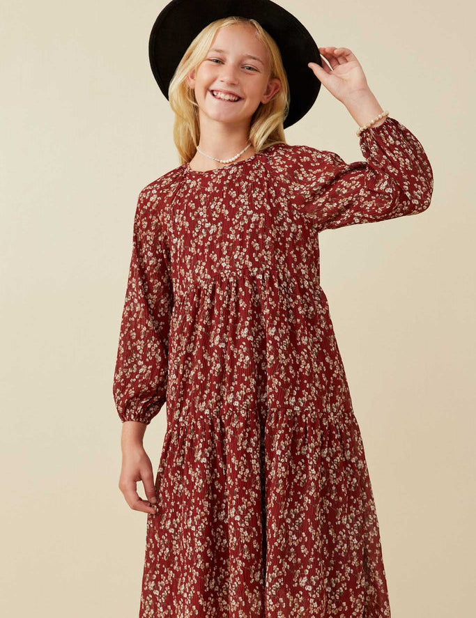 Girls Textured Floral Puff Sleeve Midi Dress- Burgundy