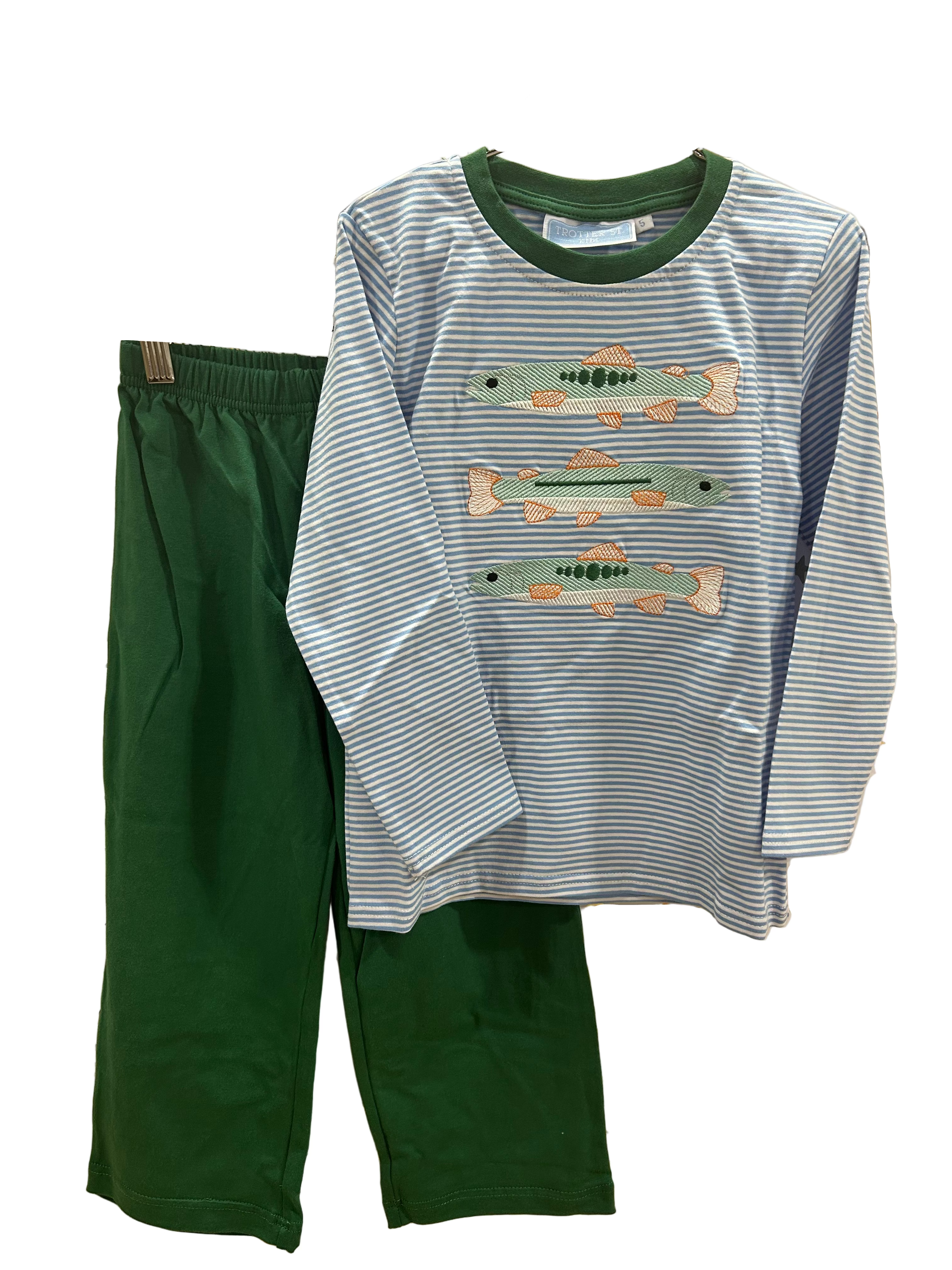 Hook the perfect outfit with this comfy trout-themed pant set! Featuring a soft, breathable top decorated with a playful trio of colorful trout and paired with easy-pull jogger pants, this set keeps your little explorer cozy and cute from playtime to picture day. Durable, lightweight, and made for adventure—just like your little guy.