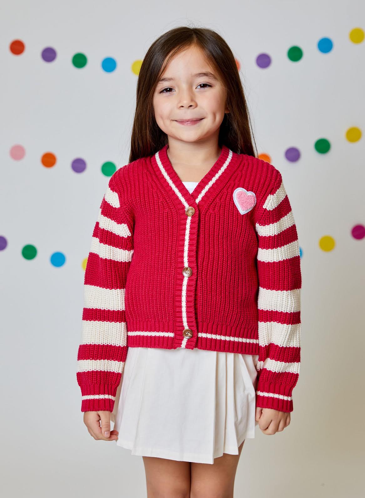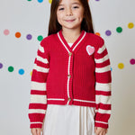 Playful and cozy, the Black Cherry Heart Cardigan is a standout layering piece with bold charm. Featuring a vibrant red body with contrasting white and red sleeves, it brings a fun pop of color to any outfit. A heart-shaped patch on the left chest adds a sweet detail, while the full button-down front makes for easy on-and-off.