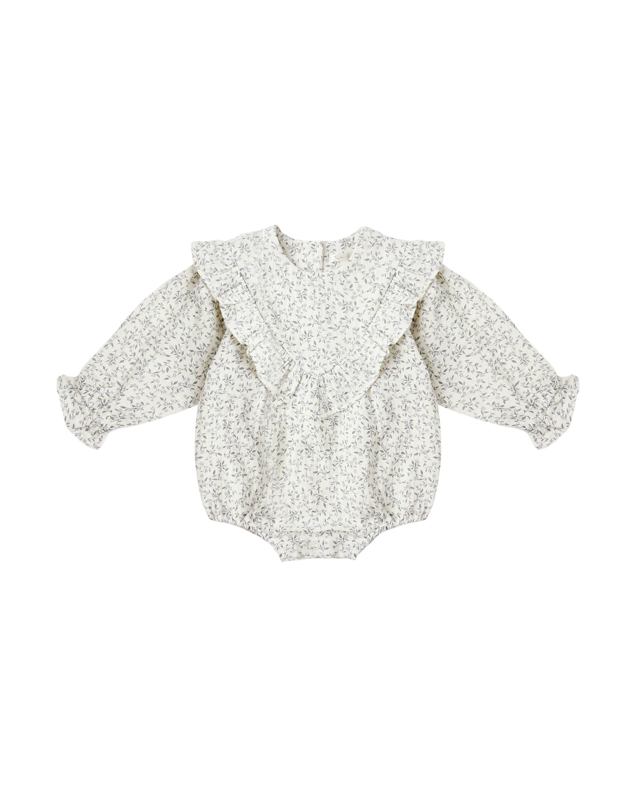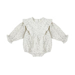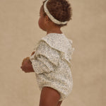 Our Winnie Romper features darling V ruffle trim, elasticized sleeve and leg openings for a sweet bubble silhouette, and bottom snaps for easy changes.