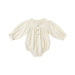 Our Callie Romper features a sweet embroidered collar, smocked front, and gathered long sleeves. Buttons at the back and snaps at the bottom make for easy dressing.