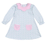 Imagine a beautifully crafted Pima cotton dress, soft and breathable with a delicate feel. The dress features a charming pink scalloped neckline that adds a touch of sweetness. The pink front pockets complement the scalloped detail and offer a practical yet stylish element. Featuring dainty mini florals blooming throughout with soft pink, blue & green hues makes this dress the perfect new addition to her wardrobe.