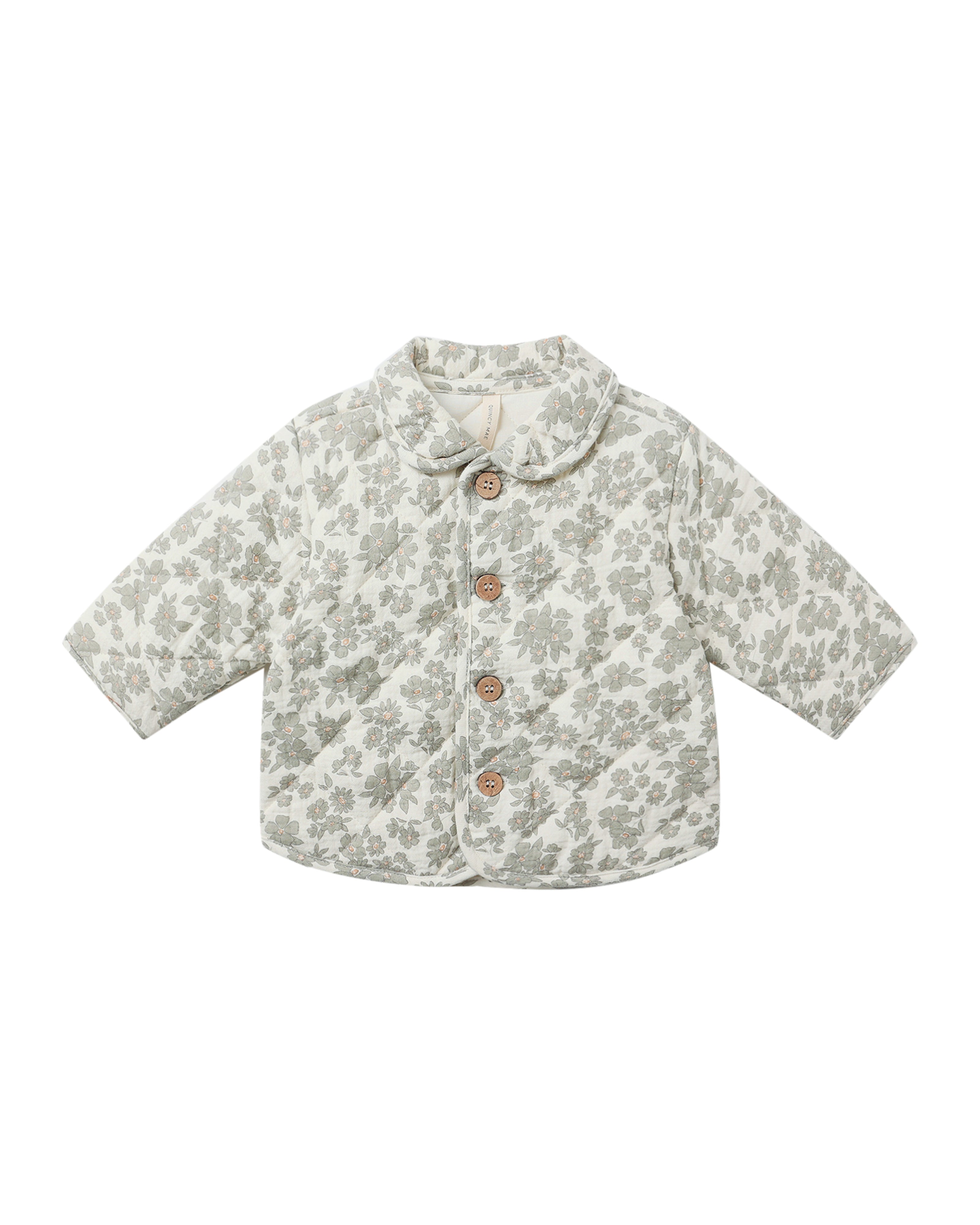 Darling quilted jacket with a sweet Peter Pan collar and coconut buttons down the front, designed to keep your little gal warm and stylish.