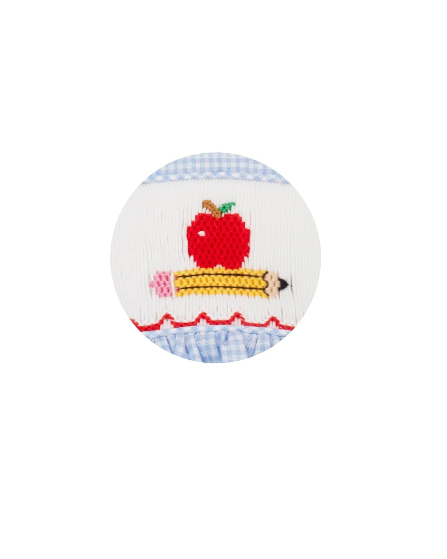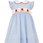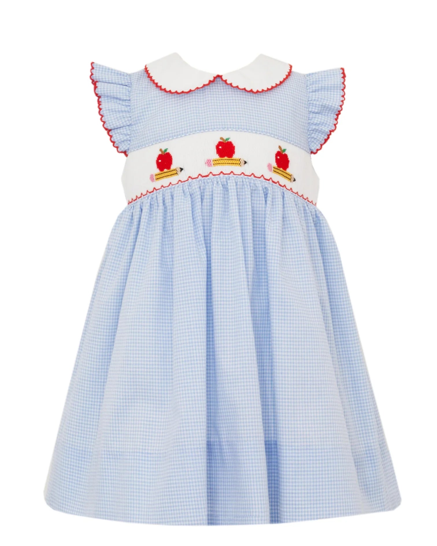 Sweeten up her school day style with this beautifully crafted light blue gingham dress. Featuring delicate hand stitched apple and pencil embroidery across the chest, this dress is perfect for back to school photos, a fun day at school or everyday charm. The sleeveless design is accented with flutter cap sleeves trimmed in red piping for a pop of color. A crisp white Peter Pan collar, also edged in red, completes the timeless look.