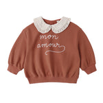 Our Collared Sweatshirt made from our french terry fabric. This sweatshirt has an embroidered ruffled collar, button closure on the back and a gathered sleeve and waist for a relaxed fit.