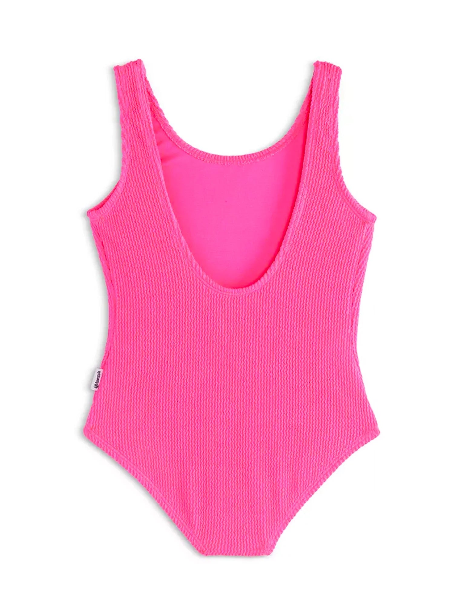 A classic silhouette, this girl's one-piece swimsuit has a low-scoop back in a stretchy, comfortable crinkle fabric that was created to fit and flatter different body types and sizes. Our Ester suit is the perfect essential swimsuit for preteens and tween girls, whether you're lounging by the pool or diving in.