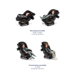 - Convertible car seat designed for longevity from birth to big kid easily adapting from rear to forward-facing modes.