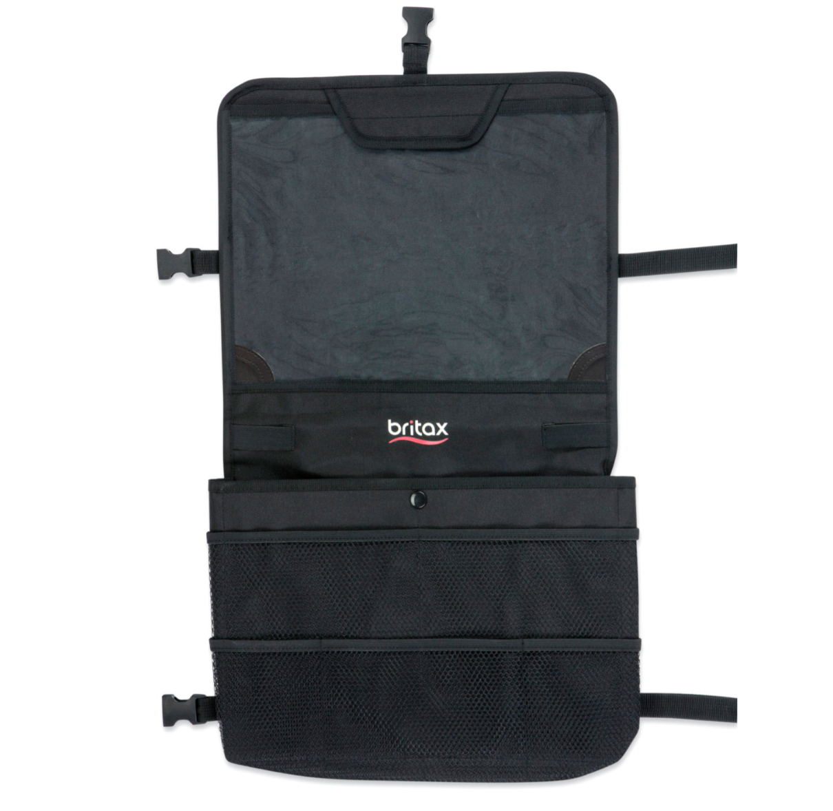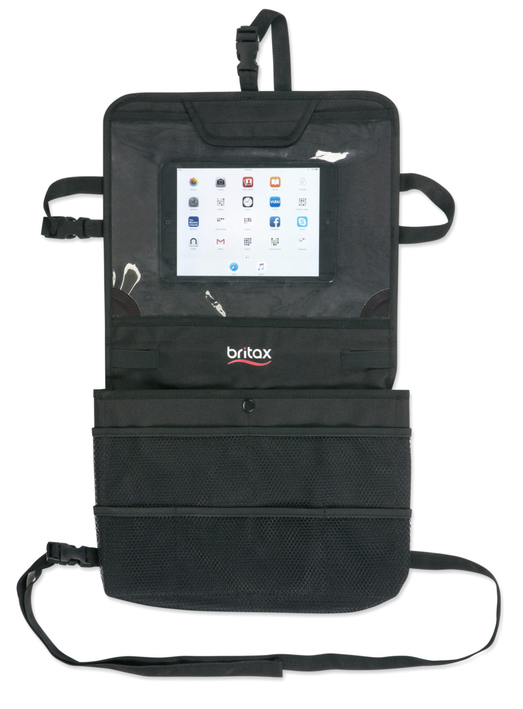 The View-N-Go Backseat Organizer makes life on the go more fun for your little one. Easily attach the organizer to the back of your vehicle seat and install a tablet for hours of entertainment. Use the large center pocket to store books, magazines, snacks and toys to keep your child smiling the entire ride. Approved for use with Britax seats