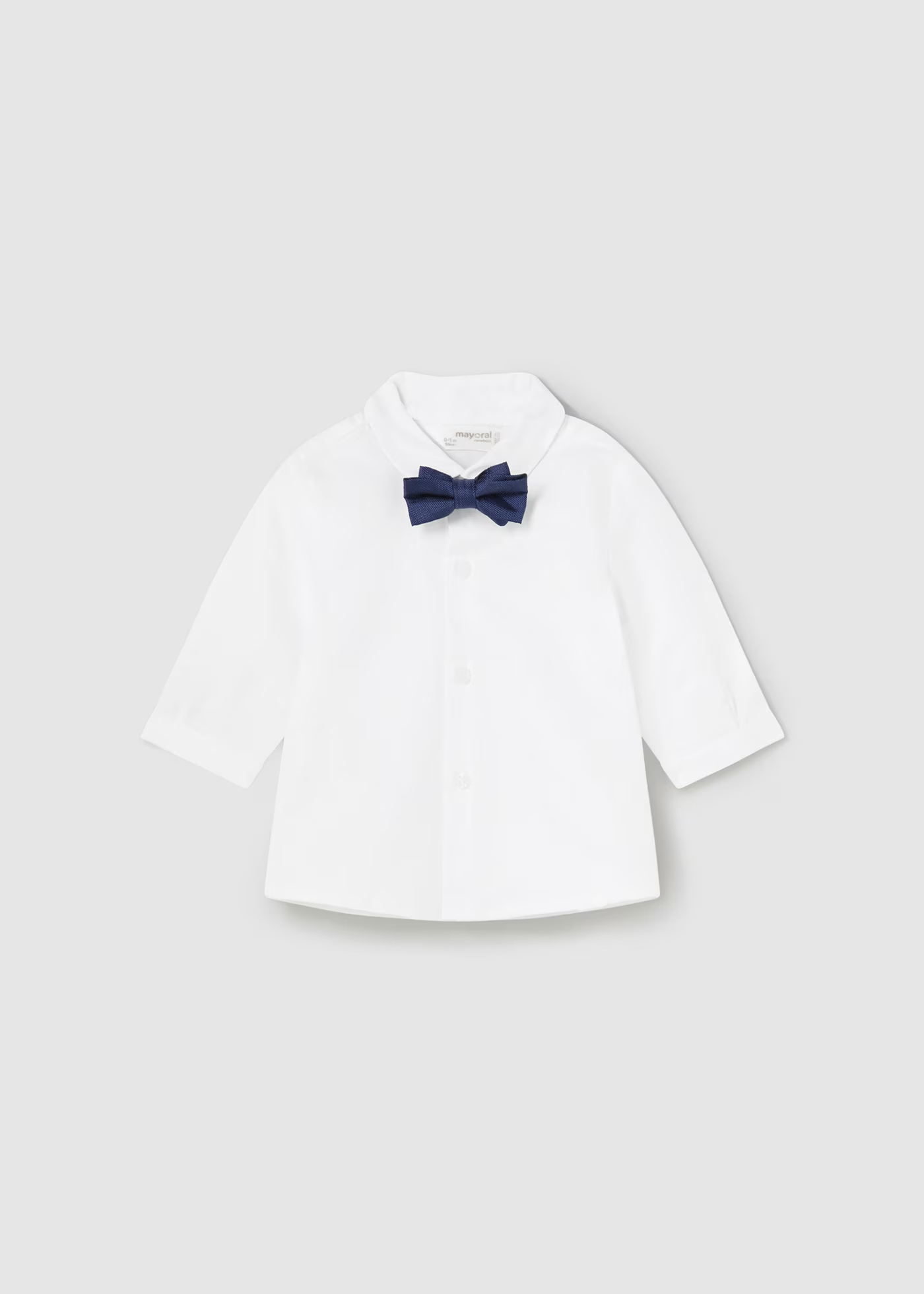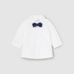 White button down shirt for baby boys. Comes with Navy blue bowtie. Perfect for special occasions.